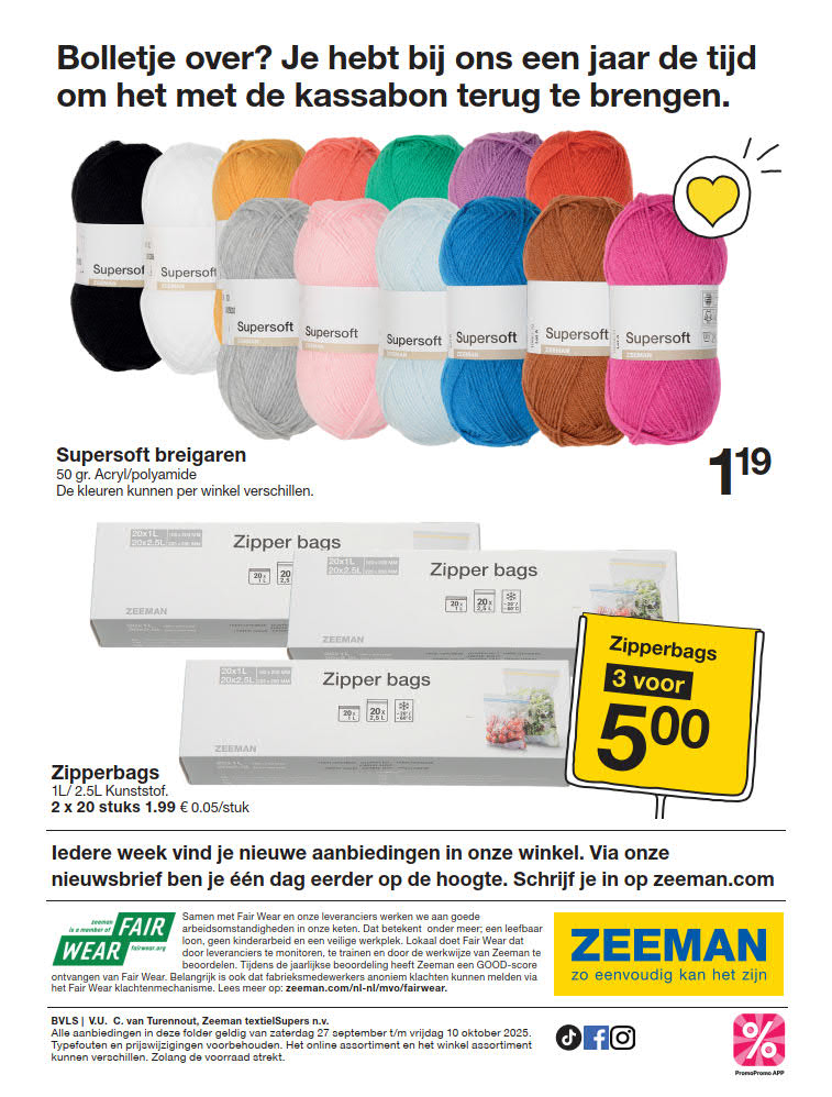 Blijf op de hoogte van de beste deals en promoties bij Zeeman door onze wekelijkse folders te bekijken, geldig vanaf 27 september tot 10 oktober. Op onze website kun je niet alleen de folders van Zeeman vinden, maar ook de meningen van andere gebruikers lezen en je eigen mening delen over de producten die je hebt gekocht. Mis geen enkele speciale actie van Zeeman en bekijk alle folders van Zeeman geldig vanaf 27 september tot 10 oktober. Wil je altijd als eerste op de hoogte zijn van de beste deals bij Zeeman? Abonneer je dan op onze wekelijkse nieuwsbrief en ontvang alle nieuwe updates en promoties voor allerlei producten uit de verschillende folders. Bespaar geld met de kortingen bij Zeeman, en bekijk ook de folders van andere winkels om te vergelijken en nooit meer een goede deal te missen. Ga nu snel naar onze website om de laatste nieuwe folders en exclusieve promoties van verschillende winkels te bekijken en schrijf je in voor onze nieuwsbrief!